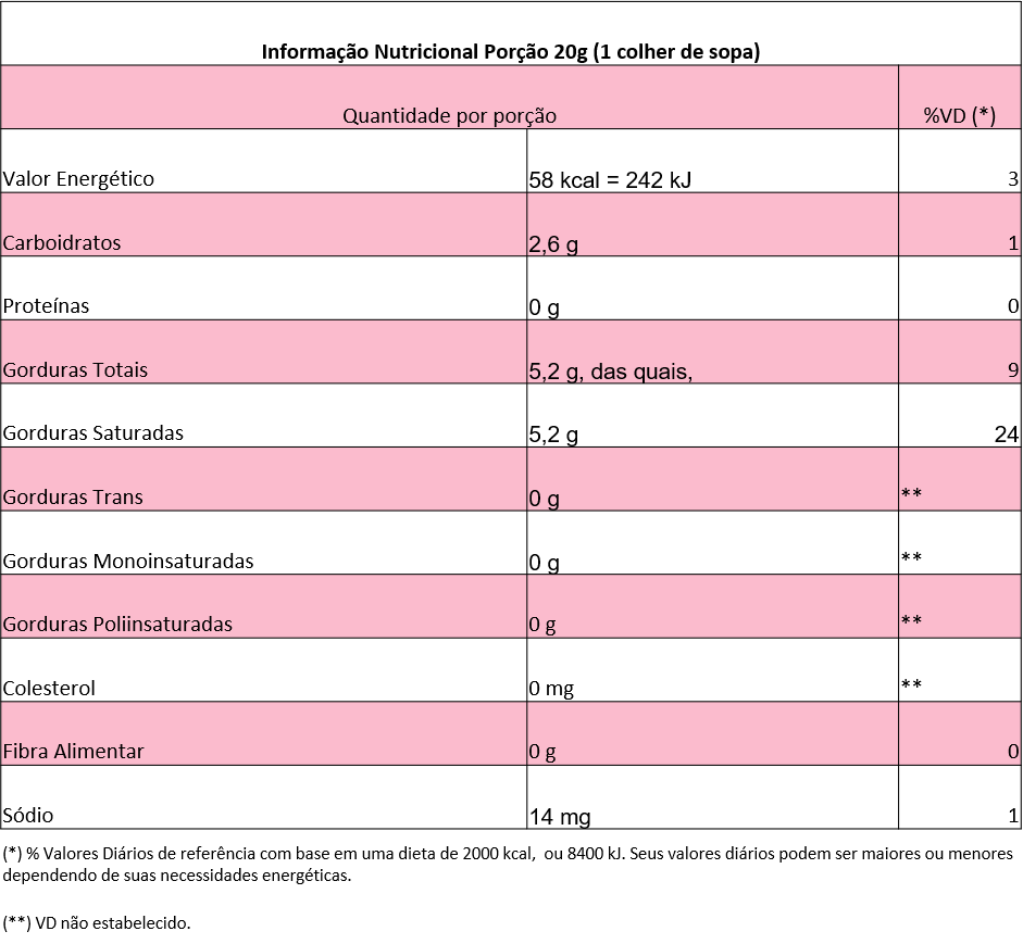 Água, gordura vegetal hidrogenada, açúcar, caseinato de sódio e sal, estabilizantes: sorbitol (INS 420), hidroxipropilcelulose (INS 463) e alginato de sódio (INS 401), emulsificantes: ésteres de ácido diacetil tartárico e mono e diglicerídeos (INS 472e), lecitina de soja (INS 322) e polisorbato 60 (INS 435), aromatizantes idênticos aos naturais e corante betacaroteno sintético (INS 160ai). CONTÉM LACTOSE. CONTÉM GLÚTEN. Ref.: Resolução – RDC N° 136, de 8 de FEVEREIRO de 2017. Lei N° 10.674, de 16 de MAIO de 2003.