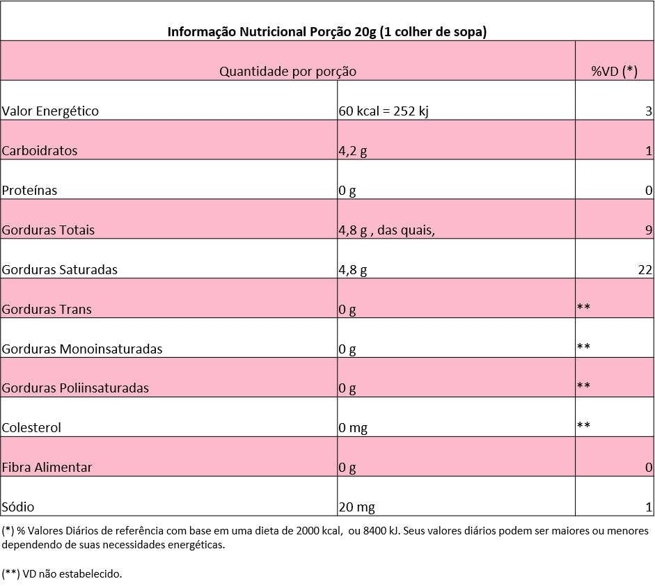 Água, gordura vegetal hidrogenada, açúcar, proteína de leite e sal, estabilizantes: sorbitol (INS 420), carboximetilcelulose sódica (INS 466), hidroxipropilmetilcelulose (INS 464), goma tara (INS 417), goma gelana (INS 418) e carragena (INS 407), emulsificantes: polisorbato 60 (INS 435), monoestearato de sorbitana (INS 491), éster de ácido diacetil tartárico e mono e diglicerídeos (INS 472e), lecitina de soja (INS 322), estearoil 2 lactil lactato de sódio (INS 481i), aromatizantes idênticos aos naturais, corante betacaroteno sintético (INS 160ai) e regulador de acidez: fosfato dissódico (INS 339ii), citrato de sódio (INS 331iii). CONTÉM LACTOSE. CONTÉM GLUTÉN. Ref.: Resolução – RDC N° 136, de 8 de FEVEREIRO de 2017. Lei N° 10.674, de 16 de MAIO de 2003.