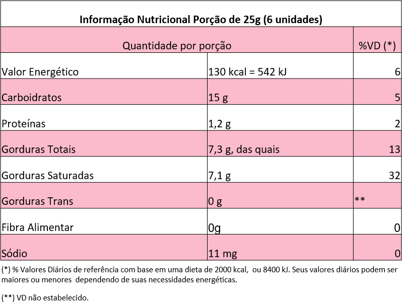 Açúcar, gordura vegetal modificada, cacau em pó, massa de cacau, emulsificante lecitina de soja e aromatizante natural. CONTÉM LACTOSE. CONTÉM GLÚTEN. Ref.: Resolução – RDC N° 136, de 8 de FEVEREIRO de 2017. Lei N° 10.674, de 16 de MAIO de 2003.